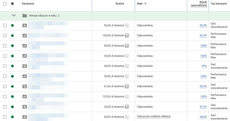 Sprawdź, czy Twoje elastyczne reklamy w wyszukiwarce (RSA) mają status "Dobra" lub "Świetna" w ocenie skuteczności reklamy.