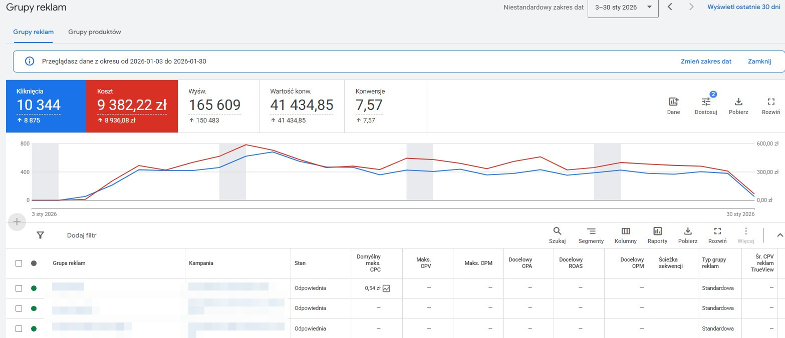 - Logiczny podział kampanii oraz ścisłe dopasowanie słów kluczowych do treści reklam i landing page'a obniża koszty kliknięć (CPC).