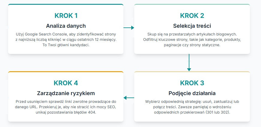 Jak widać, realizacja tej strategii wymaga kompleksowego podejścia i stałej weryfikacji wielu aspektów. Ważne jest, aby dokładnie przeanalizować każdy przypadek usunięcia treści i upewnić się, że wszelkie działania są zgodne z najlepszymi praktykami SEO, minimalizując ryzyko negatywnych konsekwencji.