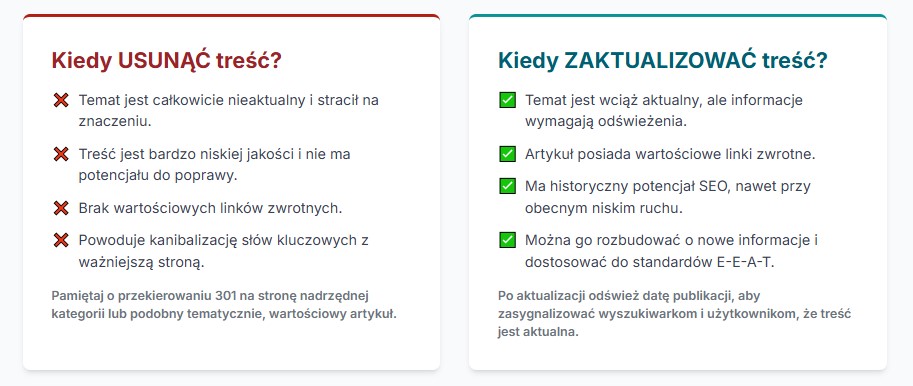 Aktualizacja treści zamiast jej usuwania jest szczególnie korzystna w przypadku materiałów, które mają już linki zwrotne lub historyczny potencjał SEO. Dzięki temu możesz zachować ich wartość, jednocześnie zwiększając ich atrakcyjność dla użytkowników i poprawiając pozycję w wynikach wyszukiwania. To podejście sprawia, że content pruning staje się bardziej elastycznym narzędziem, które można dostosować do Twoich celów!