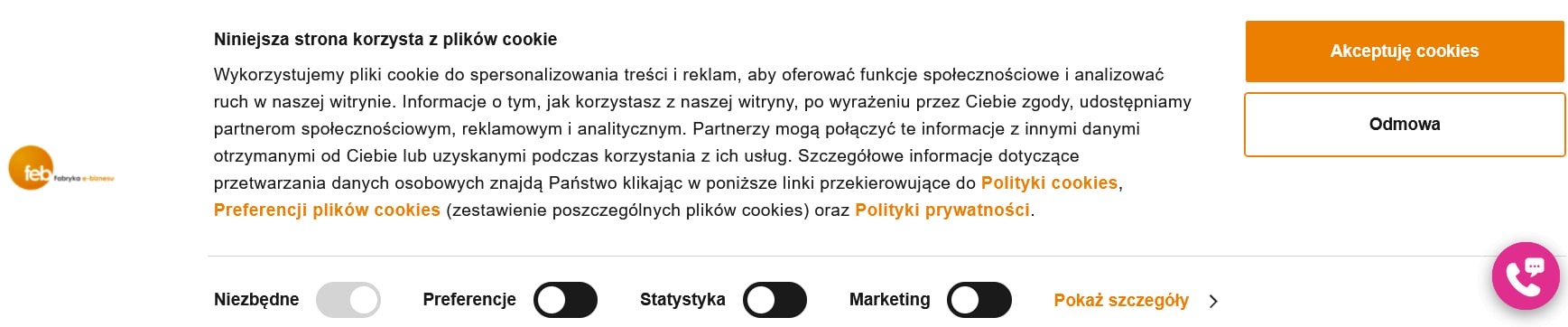 Podczas pierwszej wizyty na stronie internetowej użytkownikowi wyświetlane jest okno z możliwością wyboru kategorii danych (ciasteczek), na których zapisywanie i przetwarzanie się zgadza.