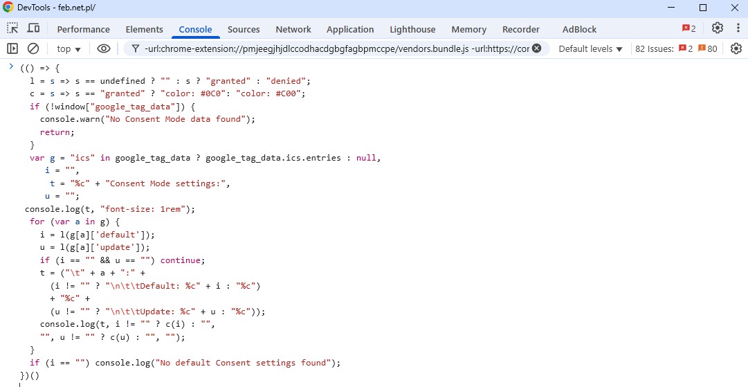 Istnieje jeszcze inna, szybsza metoda. Najpierw otwórz w przeglądarce Chrome stronę, którą chcesz zbadać. Następnie włącz narzędzia deweloperskie (DevTools) klikając na klawiaturze przycisk F12. Przejdź do zakładki Console i wklej tam następujący kod, po czym kliknij enter: