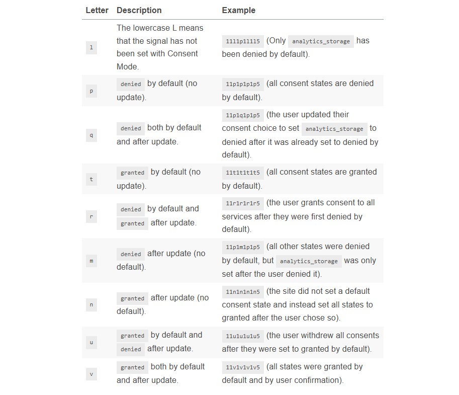 W wersji V2 Consent Mode, parametr gcd to coś w rodzaju dziennika decyzji – zapisuje nie tylko, na co użytkownik się zgodził, ale też jak do tego doszło. Google dzięki temu wie, czy zgoda była przyznana z automatu, czy kliknięta ręcznie, czy może cofnięta. Te informacje są przekazywane poprzez kombinację statusów oznaczanych konkretnymi literami.