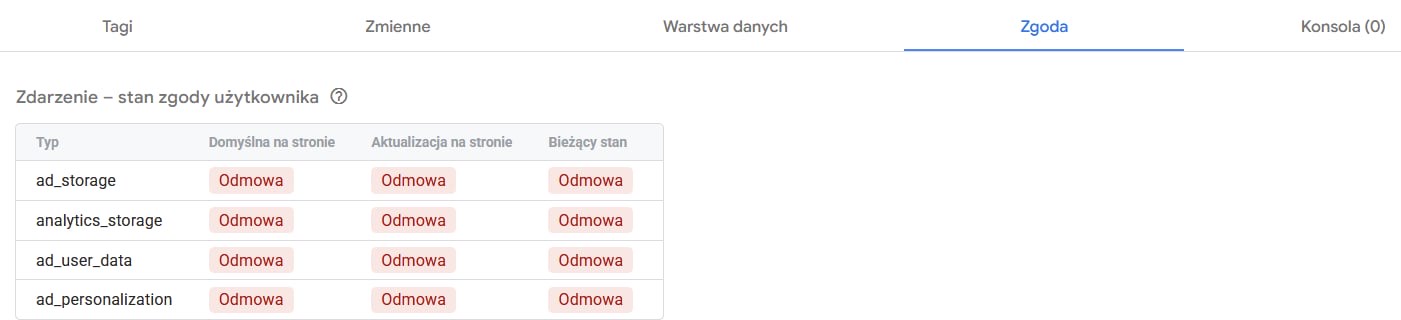 W pierwszym przypadku widać sytuację, w której użytkownik nie wyraził zgody na zbieranie danych – wszystkie kategorie, takie jak ad_storage, analytics_storage, ad_user_data czy ad_personalization, mają status “odmowa” zarówno w ustawieniach domyślnych, jak i w bieżącym stanie. To oznacza, że żadne skrypty reklamowe ani analityczne nie zostaną uruchomione.
