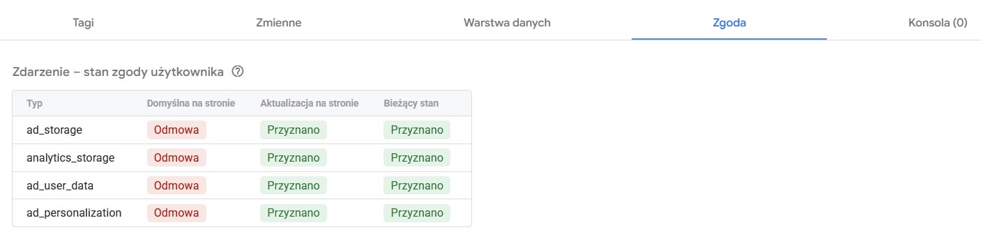 Na drugim zrzucie ekranu pokazany jest stan po wyrażeniu zgody przez użytkownika. Widać, że domyślnie zgody były odrzucone, ale po interakcji z banerem zostały zaktualizowane na “Przyznano”, a bieżący stan zmienił się na zielony. To potwierdza, że Consent Mode działa poprawnie i aktywuje odpowiednie tagi dopiero po udzieleniu zgody.