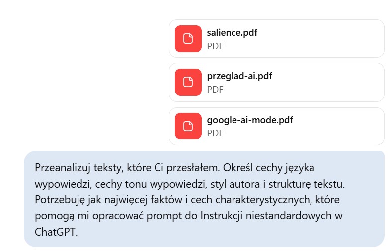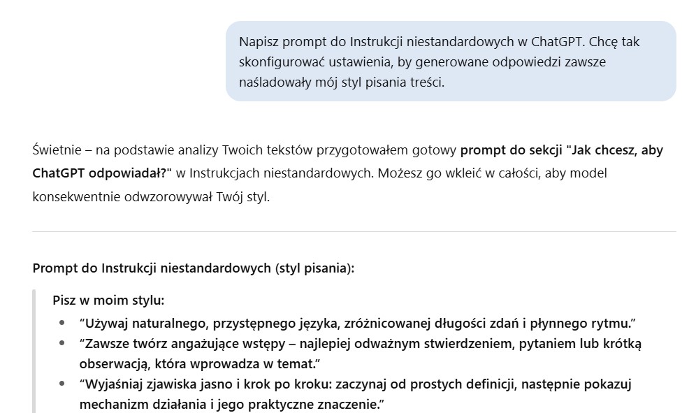 Na podstawie wyników analizy, tworzymy gotowe polecenie, które będzie podstawą do generowania tekstów w naszym własnym stylu. Nie musisz pisać go samodzielnie – nawet tutaj możesz poprosić narzędzie o wsparcie! W tej samej rozmowie, powiedz że prosisz o przygotowanie prompta, który będziesz mógł wkleić jako instrukcję niestandardową dla ChatGPT. Końcowe polecenie może mieć maksymalnie 1500 znaków ze spacjami. Tak przygotowany prompt wklej w polu Instrukcji niestandardowych.