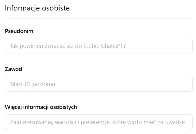 - pseudonim – napisz, jak konkretnie powinien się do Ciebie zwracać ChatGPT