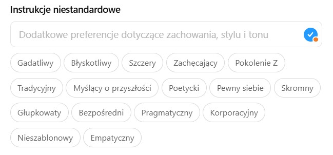 Instrukcje niestandardowe to najważniejsza sekcja w tej zakładce. To właśnie tutaj powinieneś określić swoje oczekiwania co do stylu generowanych treści. Na początek, możesz skorzystać z podpowiedzi pod polem tekstowym. Jeżeli jednak czujesz się już pewnie w sztuce promptowania, określ swoje wymagania samodzielnie! Wystarczy wpisać je w dokładnie taki sam sposób, jak pisałbyś polecenie do ChatGTP w rozmowie.