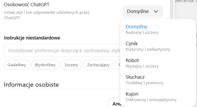 Zanim podasz własne instrukcje, możesz określić predefiniowaną osobowość ChatGPT. Warto samodzielnie przetestować te style, by określić, co najlepiej odpowiada Twoim potrzebom. Osobiście korzystam jednak z opcji domyślnej – ważne instrukcje lepiej określić samodzielnie.