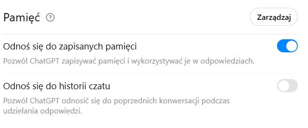 W tym miejscu trzeba wspomnieć o pamięci ChatGPT. Jak widzisz na powyższej grafice, można zarządzać także dostępem do historycznych danych z prowadzonych rozmów. Te dwie opcje mogą wydawać się dość podobne, ale w praktyce różnica między nimi jest naprawdę istotna.