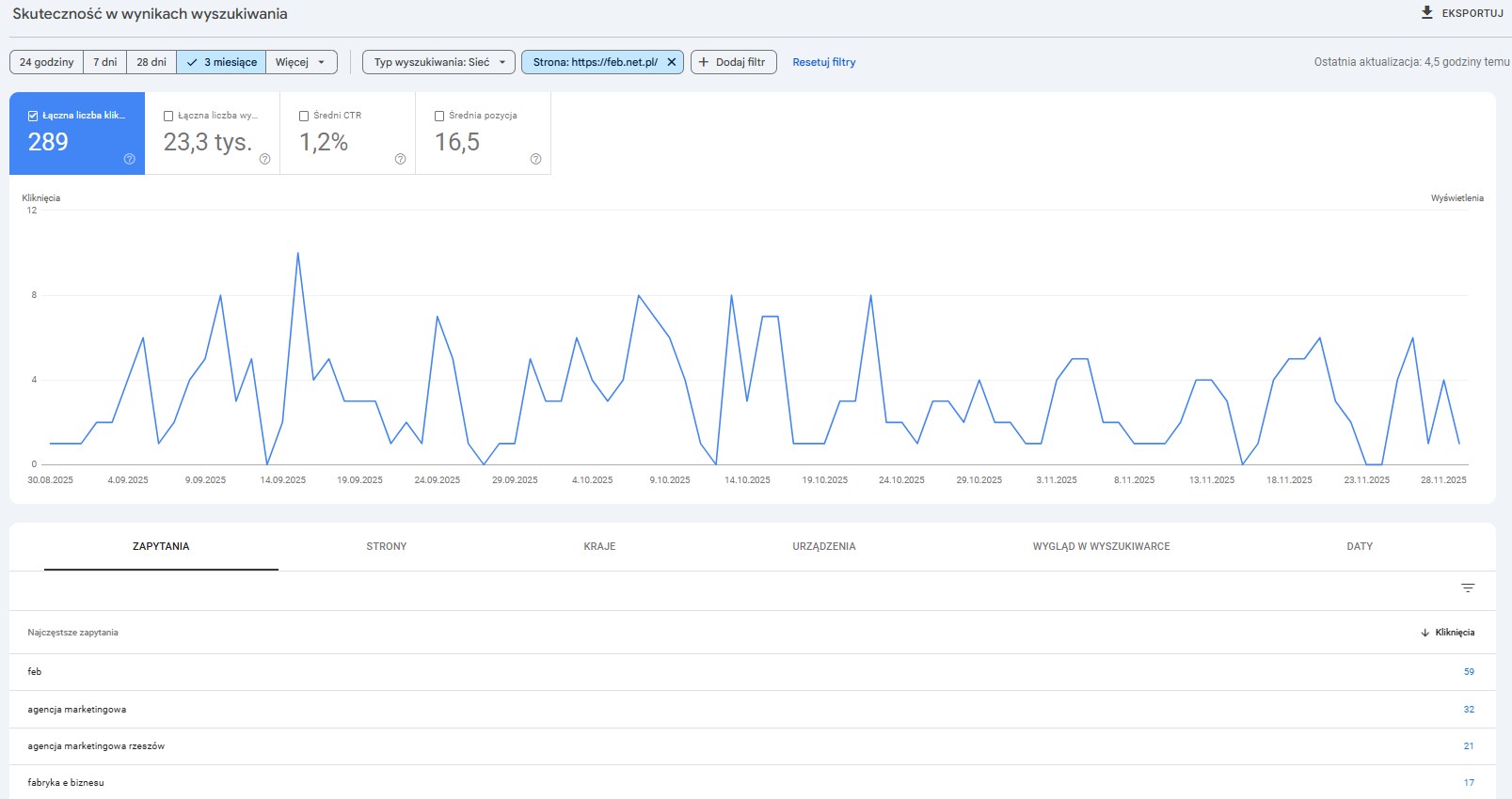 Do precyzyjnej analizy własnych fraz wykorzystaj Google Search Console – sprawdzisz tam realne kliknięcia, wyświetlenia, CTR i pozycje.