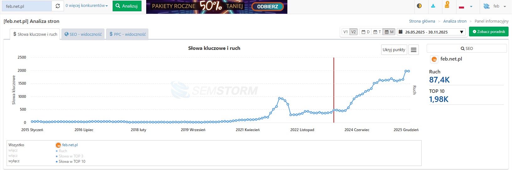 Liczba fraz kluczowych, na które portal jest widoczny w Google wg. Semstorm