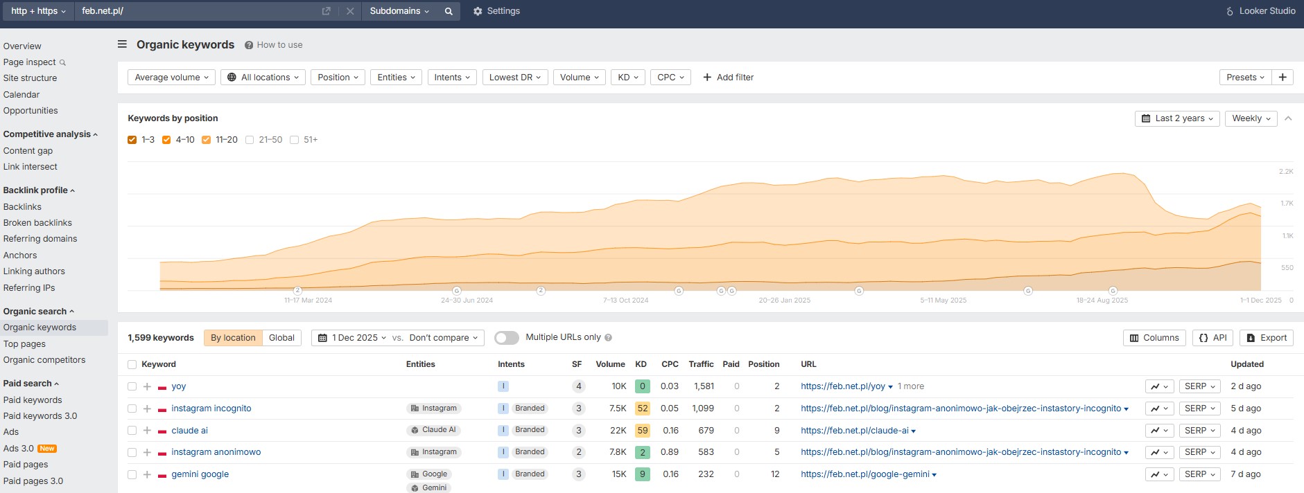Pozycje słów kluczowych, na które portal jest widoczny w Google wg. Ahrefs