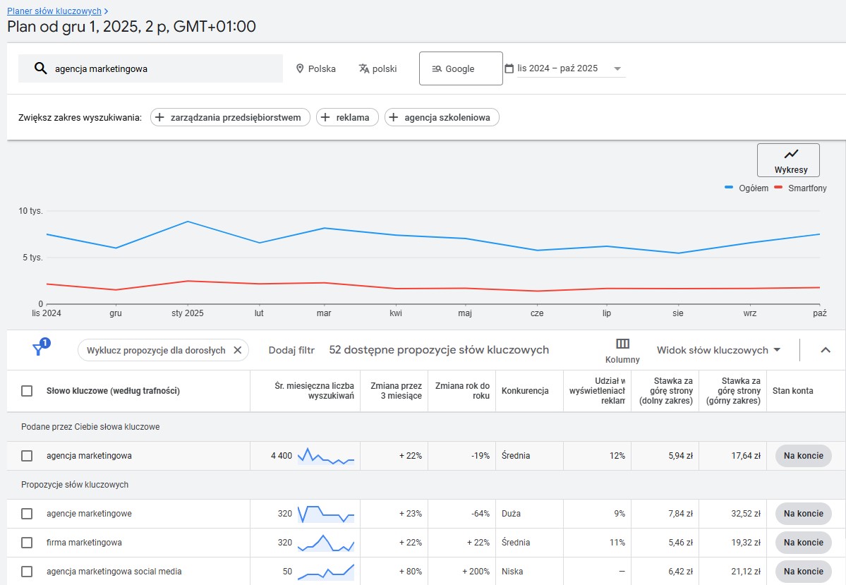 Analizując wyniki, pamiętaj o jakości ruchu. Duża liczba wejść to nie zawsze sukces – kluczowe jest to, czy frazy odpowiadają intencjom zakupowym użytkowników i prowadzą do konwersji.