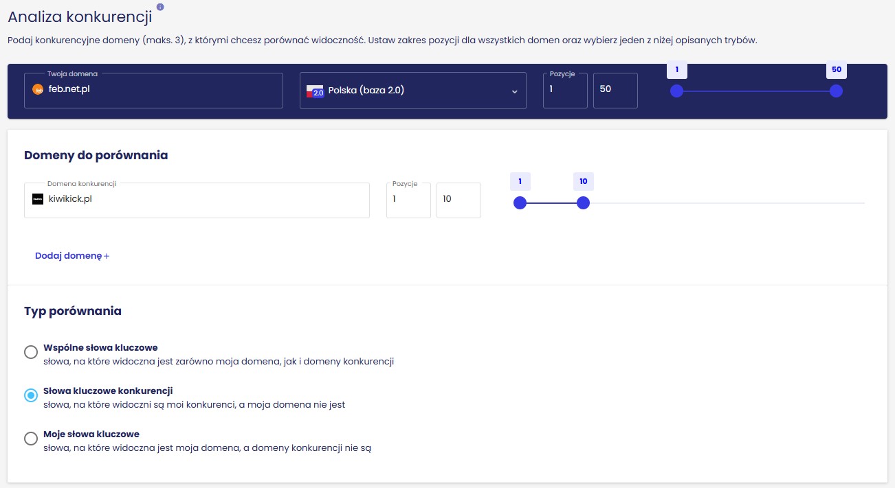 Bardzo przydatny jest też oddzielny raport "Analiza konkurencji". Pozwala on zidentyfikować frazy, na które konkurencja plasuje się w TOP 10, a Twoja witryna jest niżej lub nie ma jej wcale. Dzięki temu możesz uzupełnić swoją strategię o nowe, skuteczne słowa kluczowe!