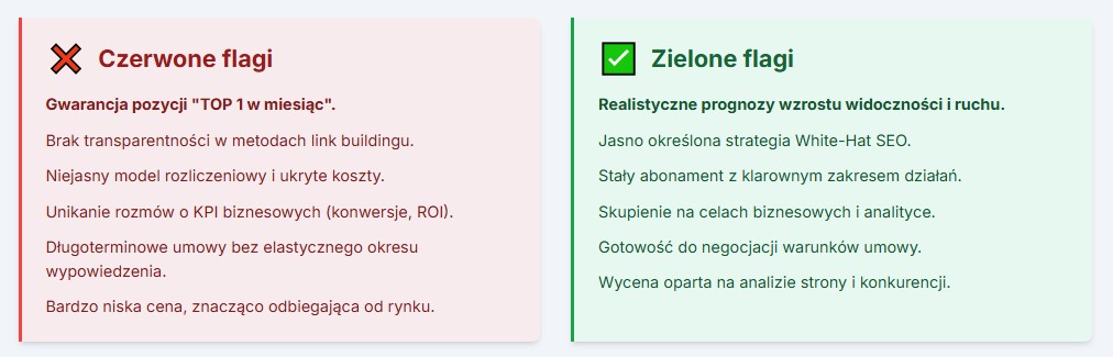 To bardzo ważny punkt, który powinien zapalić Ci czerwoną lampkę. Jeśli agencja gwarantuje Ci "TOP 1 w miesiąc" na konkurencyjne frazy, podziękuj za rozmowę i szukaj dalej. Nikt nie jest w stanie dać gwarancji pozycji w Google, ponieważ algorytm jest złożony i zmienny, a na wyniki wpływa także Twoja konkurencja.
