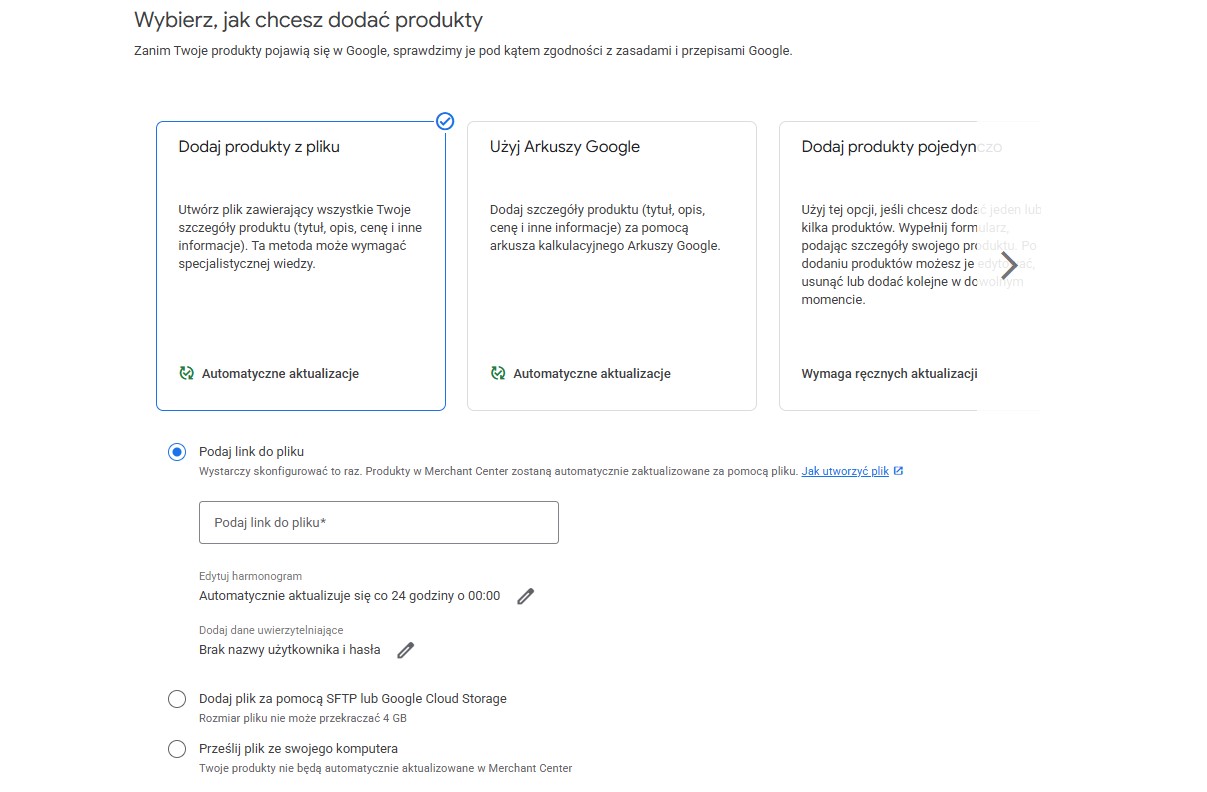 Czwarty i najważniejszy krok to dodanie feedu produktowego. Na tym etapie decydujemy, w jaki sposób Google będzie pobierać informacje o produktach z naszego sklepu. Mamy do wyboru kilka opcji – od ręcznego dodawania pojedynczych pozycji, po w pełni zautomatyzowane rozwiązania. Zdecydowanie zaleca się jednak metody dynamiczne, ponieważ dane o produktach – ceny, dostępność czy opisy – potrafią zmieniać się nawet codziennie.