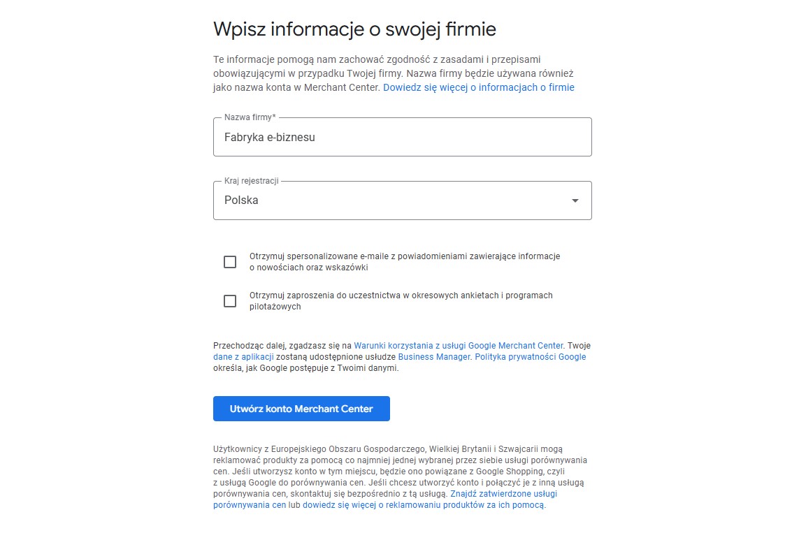 Teraz należy podać jeszcze nazwę firmy i określić, czy chcemy otrzymywać e-maile z wiadomościami i wskazówkami od Google. Na tym etapie potwierdzamy też warunki korzystania z usługi Google Merchant Center. Pozostaje już tylko kliknąć przycisk "Utwórz konto Merchant Center" i gotowe! Twoje konto zostało utworzone, więc możesz przejść do konfiguracji.