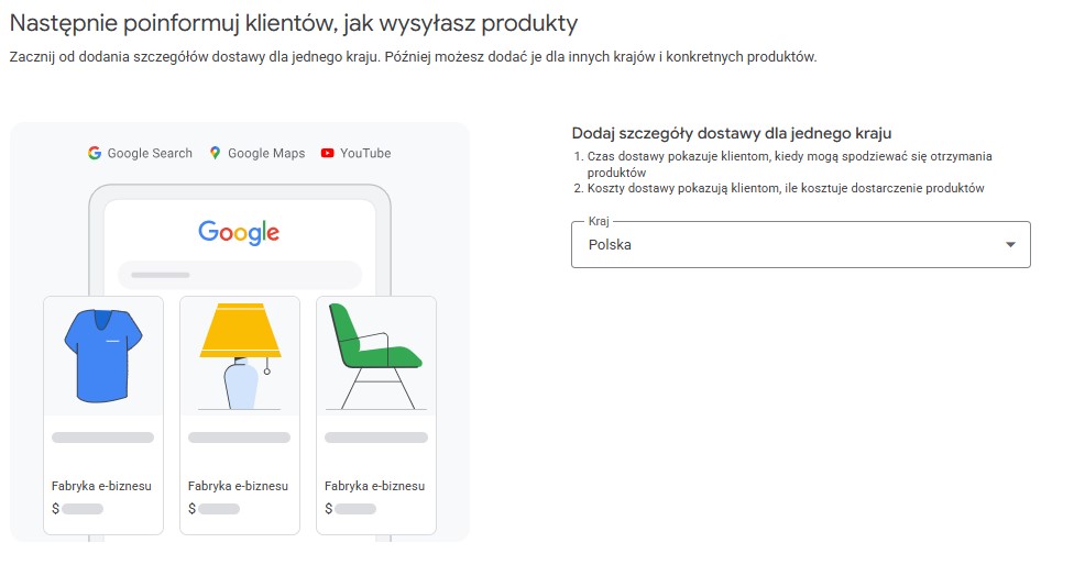 Ostatni krok tego konfiguratora prosi nas o określenie, w jaki sposób wysyłamy produkty do wskazanego kraju. Wybieramy tutaj czas realizacji i koszty przesyłki, które będą widoczne dla użytkowników w wynikach Google.