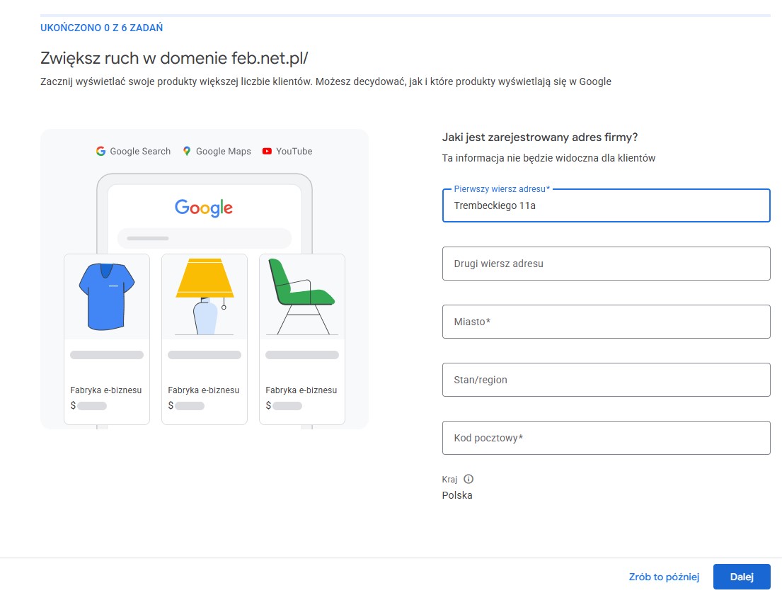 Pierwsze okno, jakie należy uzupełnić, to przestrzeń na dane adresowe firmy. Podaj adres swojej działalności – najlepiej taki, którym posługujesz się we wszystkich innych miejscach w sieci.