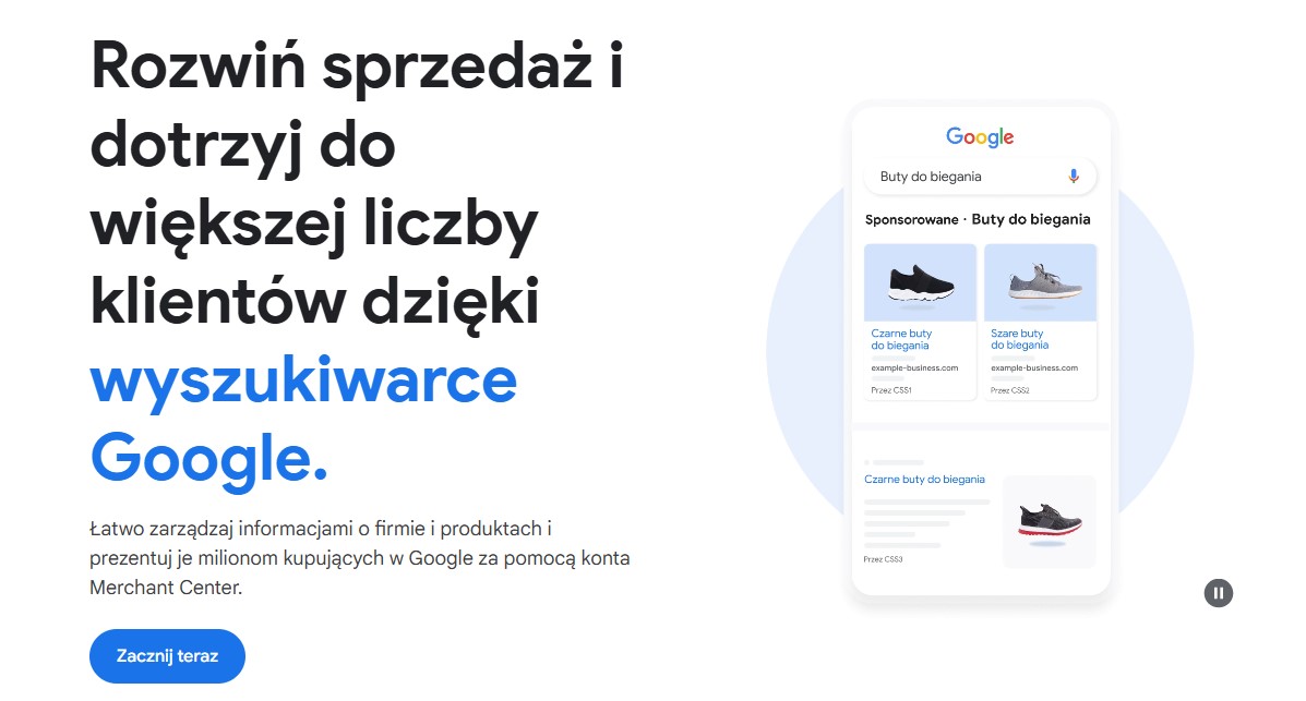 Rejestracja w GMC wymaga od Ciebie jedynie posiadania konta Google. Otwórz oficjalną stronę Google Merchant Center, kliknij Zacznij teraz i zaloguj się na swoje konto.