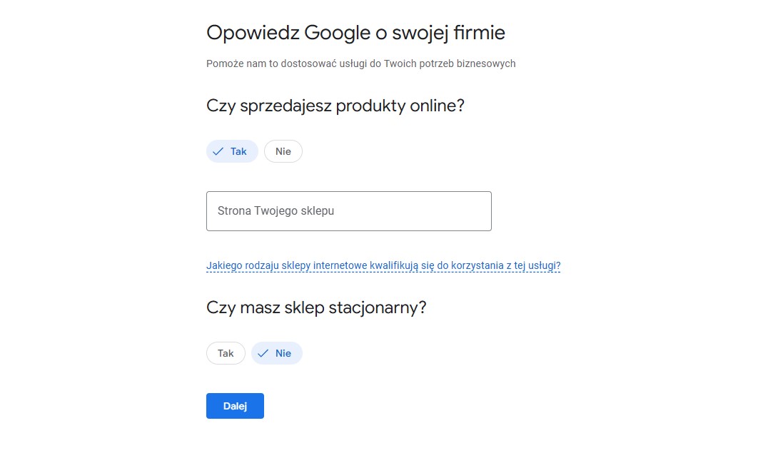 Określ charakter swojej działalności. Przekaż Google informacje, czy sprzedajesz wyłącznie online, czy prowadzisz także sklep stacjonarny.