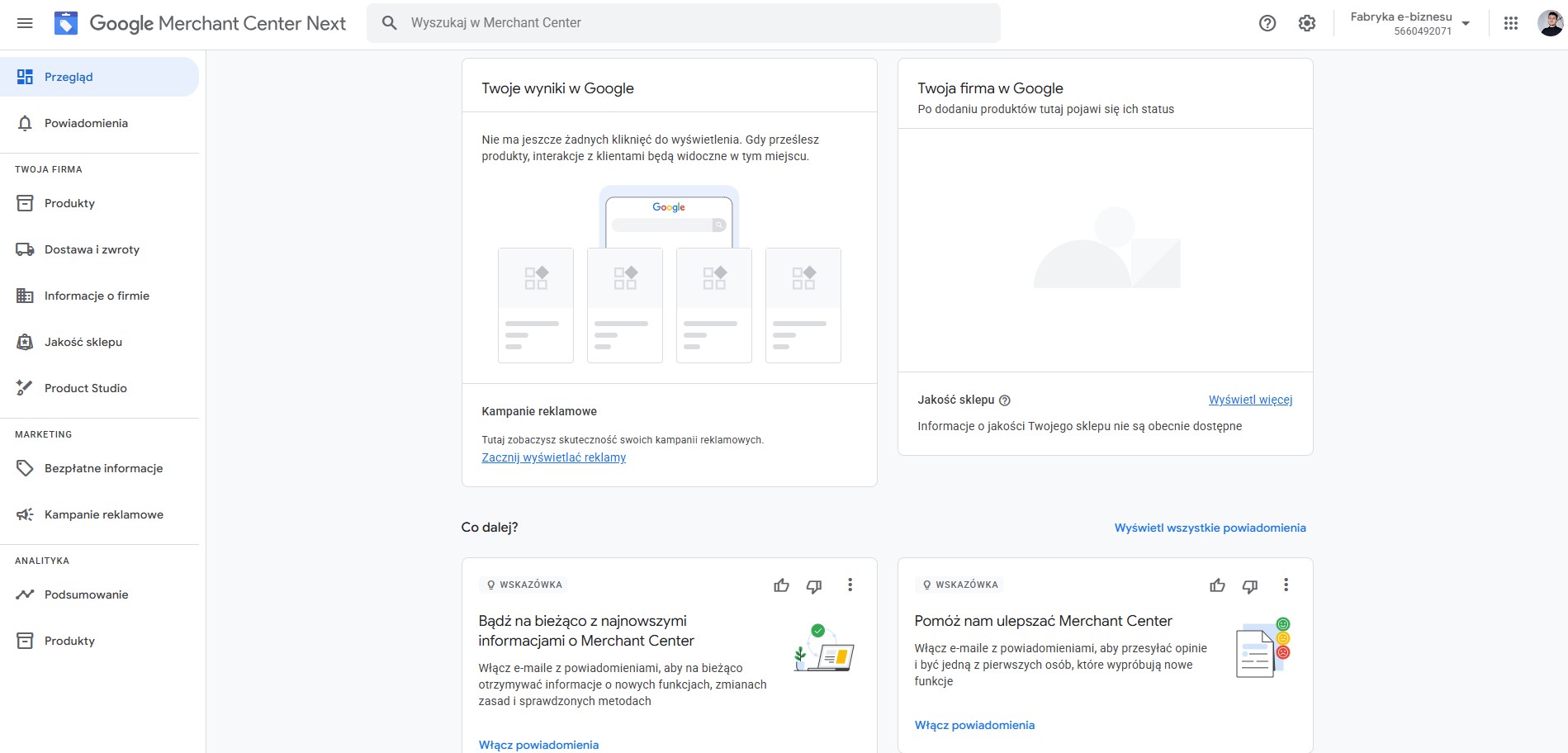 Merchant Center służy do przesyłania informacji o produktach do Google. W panelu możesz dodać feed produktowy, ustawić kraj sprzedaży, sprawdzić stan zatwierdzenia produktów i połączyć konto z Google Ads, aby wyświetlać reklamy produktowe.