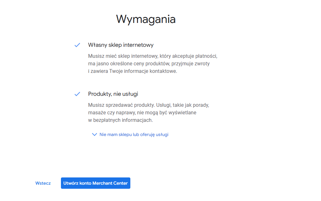 Jeżeli spełniamy te warunki, możemy kliknąć przycisk "Utwórz konto Merchant Center".
