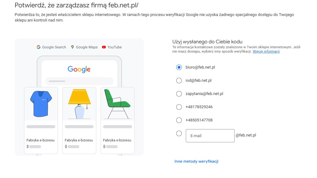 Do tego momentu podaliśmy jedynie adres URL strony internetowej. Google nie sprawdzało jednak wcześniej, czy faktycznie jest on naszą własnością. Dlatego na tym etapie musimy potwierdzić w wybrany sposób, że rzeczywiście jesteśmy właścicielami sklepu internetowego.