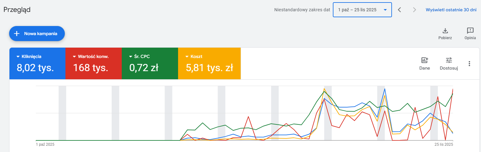 Dokładna analiza konwersji, kosztów kliknięć oraz CTR pozwala wyciągnąć wnioski na przyszłość. Przygotowuję raport sezonowości, wskazujący co zadziałało, a które elementy wymagają poprawy.