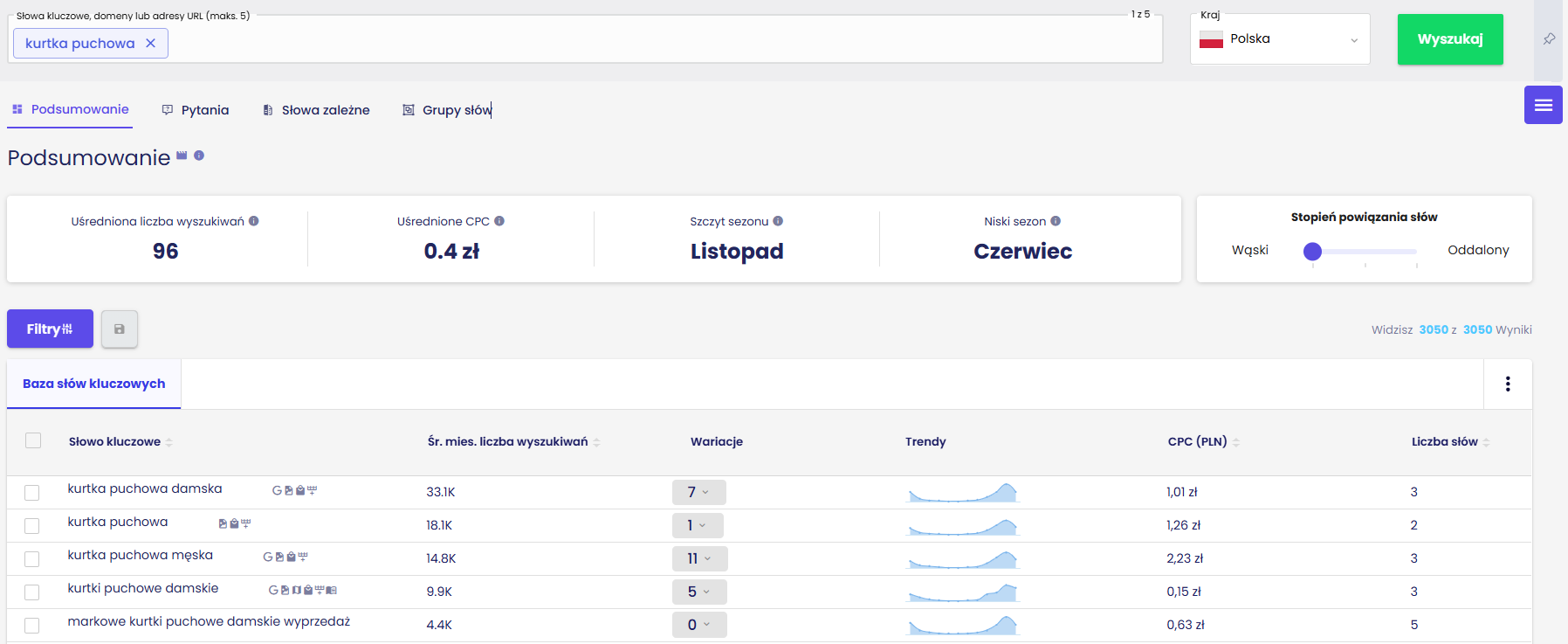 W module “Baza słów kluczowych” po wpisaniu frazy zobaczysz klarowną informację o tym, który miesiąc jest uznawany za szczyt sezonu. W komórce obok zobaczysz miesiąc o najmniejszym zainteresowaniu.