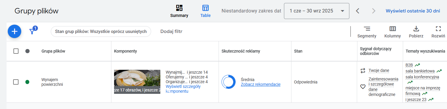 Ocenę znajdziesz w panelu Google Ads, zakładka Kampanie > Grupy plików