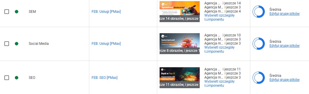 - Świetna – to nasz cel. Grupa zasobów jest w pełni rozbudowana, zawiera wszystkie opcjonalne elementy (jak linki do podstron) i oferuje dużą różnorodność kreacji.