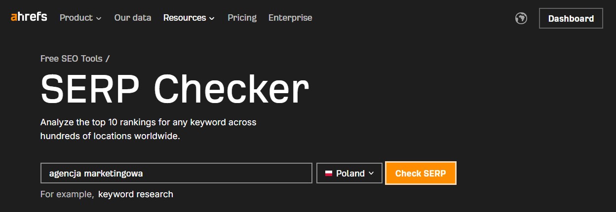 - Ahrefs SERP Checker – darmowe rozwiązanie od Ahrefs, które pozwala sprawdzić TOP 10 wyników wyszukiwania dla wpisanej frazy.