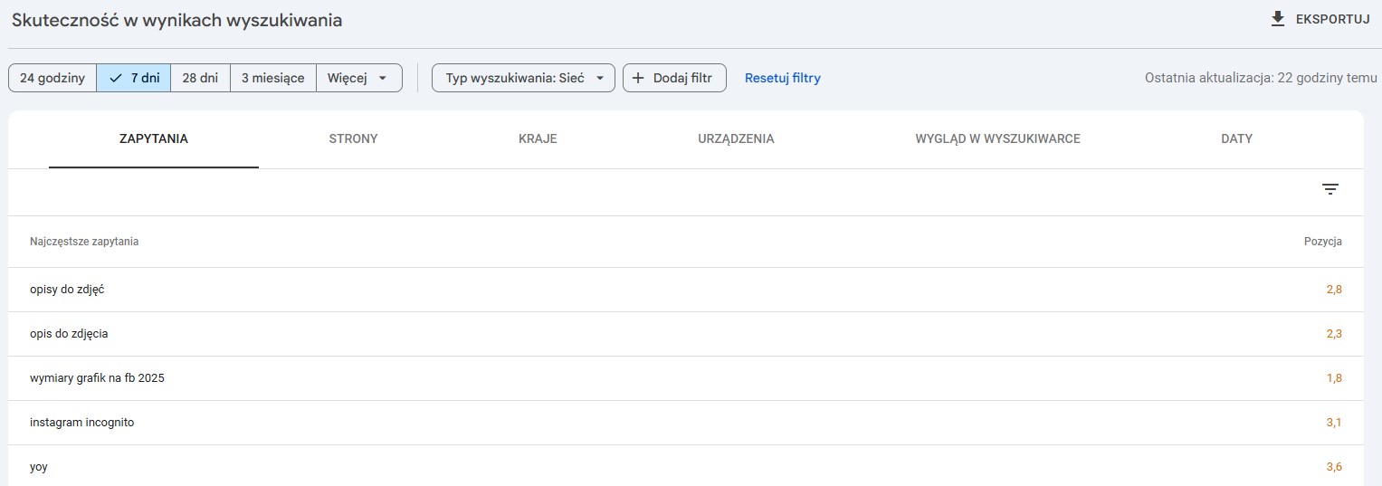 Pamiętaj jednak, że ten wskaźnik to nadal tylko uśredniona pozycja. Jeśli w ciągu dnia Twoja strona raz była na pierwszym miejscu, a raz na dziewiątym, narzędzie pokaże wartość w okolicach pięciu.