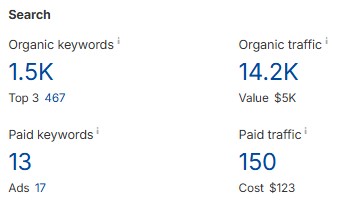 W panelu bocznym znajdziesz sekcję Search, a pod nią liczbę oznaczoną jako Organic keywords – kliknięcie jej przeniesie Cię do pełnej listy zapytań, na które widoczna jest Twoja strona.