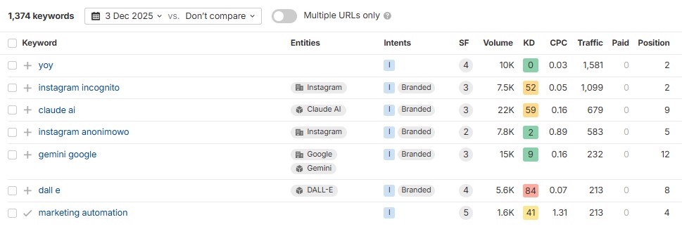 Pozycja każdej frazy jest jedną z kolumn w tabeli, więc możesz swobodnie filtrować, sortować i sprawdzać, jak zmienia się Twoja widoczność.