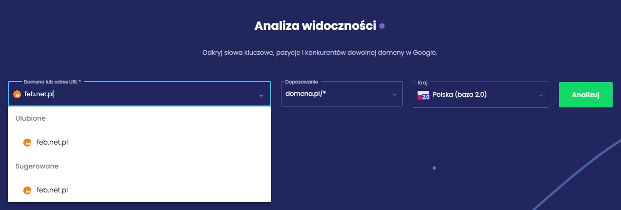 Po wejściu do panelu głównego przejdź do raportu Analiza widoczności i wpisz nazwę swojej domeny w wyszukiwarkę.