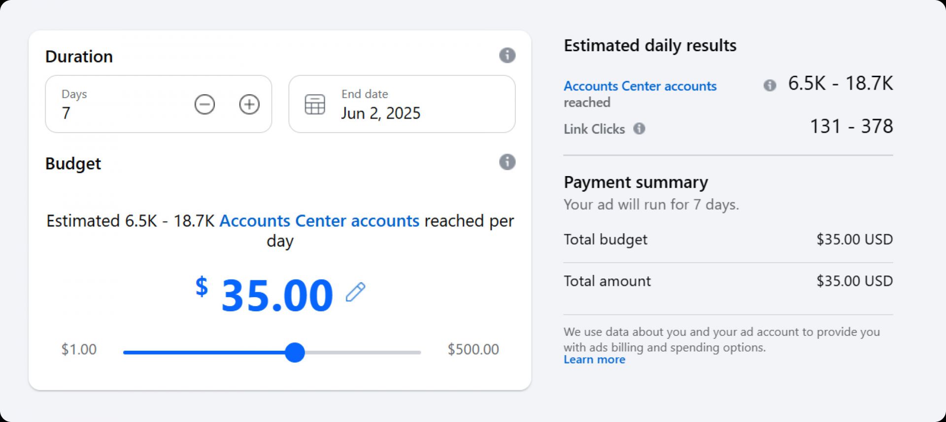 - budżet – ustal kwotę, jaką chcesz przeznaczyć na promocję; system pokaże Ci szacunkowy zasięg,