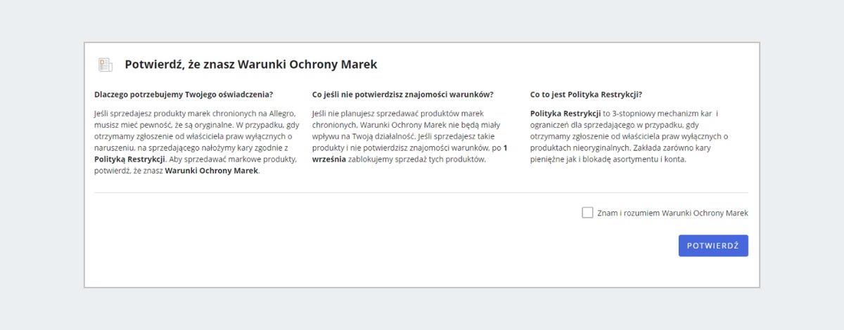 Sprzedający, którzy oferują produkty marek chronionych, muszą potwierdzić znajomość i zrozumienie Warunków Ochrony Marek. Proces ten przebiega następująco: