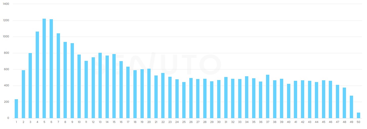 Wykres rozkładu pozycji pokazuje jasno, że większość fraz kluczowych serwisu wyświetla się w ścisłej czołówce wyników wyszukiwania. Najczęściej są to pozycje 5-6, co jest dobrym wynikiem (biorąc pod uwagę wysoką konkurencyjność tych zapytań).