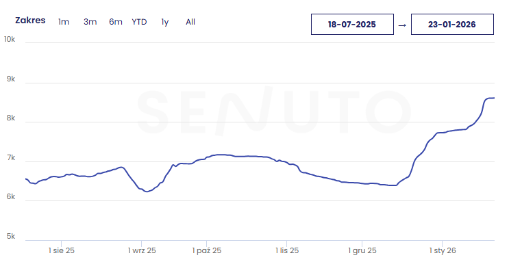Liczba fraz kluczowych w TOP 10 wyników wyszukiwania, Senuto