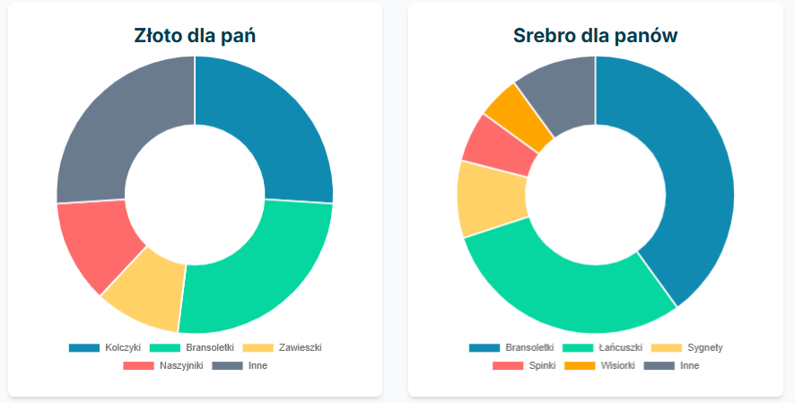 - Biżuteria damska – dominują modele złote i pozłacane. Największą popularnością cieszą się kolczyki i bransoletki (po 26% udziału w sprzedaży), a także naszyjniki (12%). Klienci chętnie sięgają po motywy serca, minimalistyczne wzory typu "żmijka" czy kolczyki w kształcie łezek.