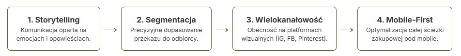 Wizualny charakter branży wymusza także wielokanałową obecność na platformach takich jak Instagram, Facebook i Pinterest, które są jej naturalnym środowiskiem.