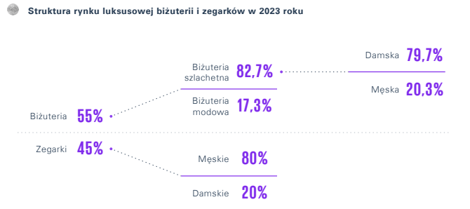 W 2023 roku biżuteria stanowiła 55% całego rynku, a zegarki pozostałe 45%. Wśród biżuterii dominowała biżuteria szlachetna (82,7%), podczas gdy biżuteria modowa odpowiadała za zaledwie 17,3% udziału.