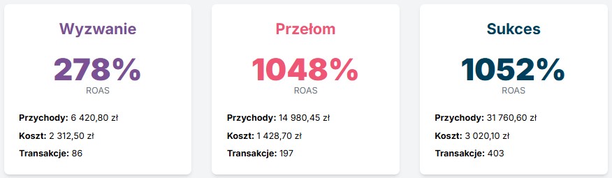 Dopiero po zrealizowaniu tego celu mogliśmy przejść do drugiej fazy – systematycznego zwiększania wolumenu sprzedaży i pozyskiwania nowych użytkowników, przy jednoczesnym utrzymaniu ustalonego z klientem wskaźnika ROAS.