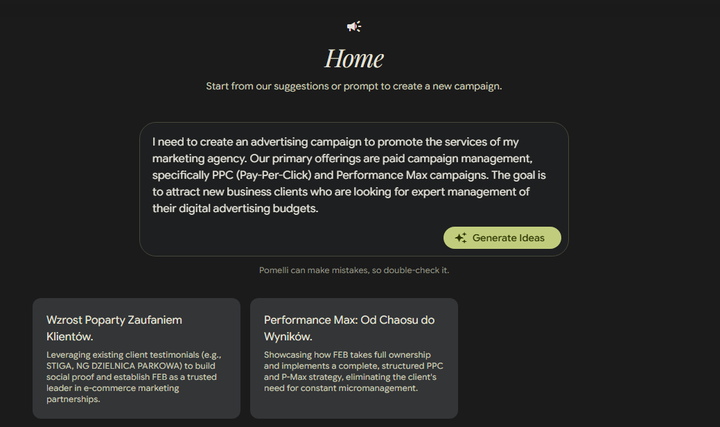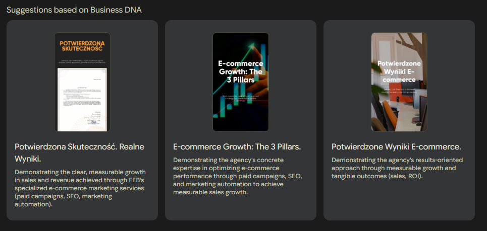 Po stworzeniu profilu DNA, Pomelli przechodzi do działania i sugeruje dopasowane pomysły na kampanie marketingowe. Użytkownik może wybrać jeden z gotowych kierunków.
