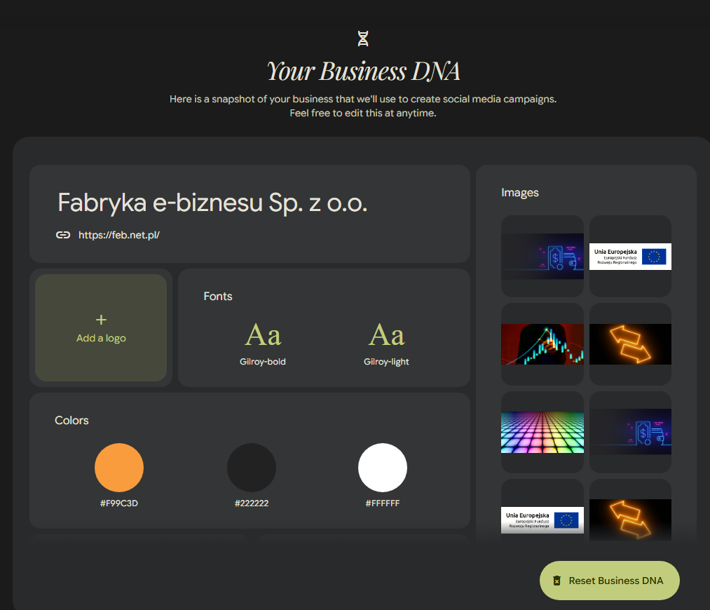 To fundament działania aplikacji. Wystarczy wkleić adres URL strony, która nas interesuje. Pomelli zaczyna od analizy strony internetowej firmy oraz jej istniejących obrazów, aby automatycznie zbudować profil Business DNA (DNA biznesu).