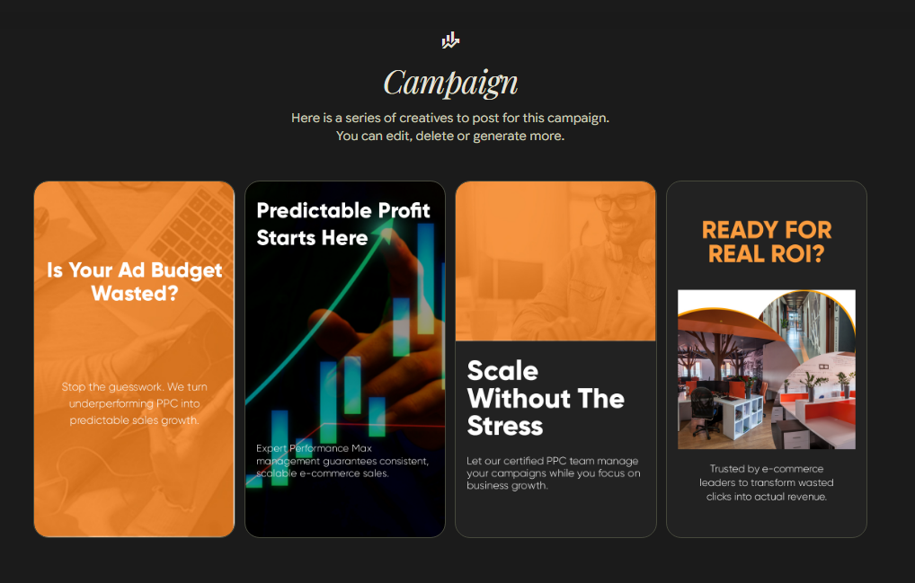 W ostatnim kroku Pomelli tworzy gotowe do użycia, brandowane zasoby marketingowe. Mogą to być posty do mediów społecznościowych, elementy na stronę internetową czy kreacje pod reklamy online.